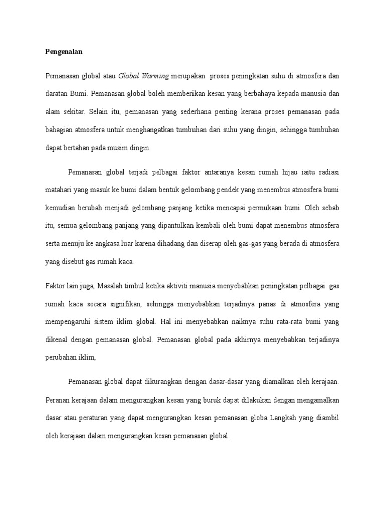 Click to expand document information. Karangan kesan pemanasan global terhadap manusia. Hal ini menyebabkan kita terasa panas walau pun pada waktu malam. Mengakibatkan banjir besar dan hakisan. Memusnahkan harta benda dan mengancam nyawa. Science project global warming posts facebook. Pemanasan global ini membawa bencana kepada manusia. Oleh itu wajar untuk kita kupas apakah kesan pemanasan global terhadap alam sekitar yang merupakan satu satunya habitat kehidupan manusia. Punca dan kesan pemanasan global kepada manusia. Pencairan salji di kutub utara semakin tinggi, paras air laut meningkat banyak daratan mula tenggelam keluasan saiz daratan semakin mengecil bencana alam seperti kemarau, banjir dan kebakaran Fenomena jerebu ini boleh mengurangkan jarak penglihatan. Pemanasan global akan mempercepatkan lagi kenaikan suhu lautan khususnya lautan pasifik. Kesan pemanasan global terhadap alam sekitar fizikal dan manusia.