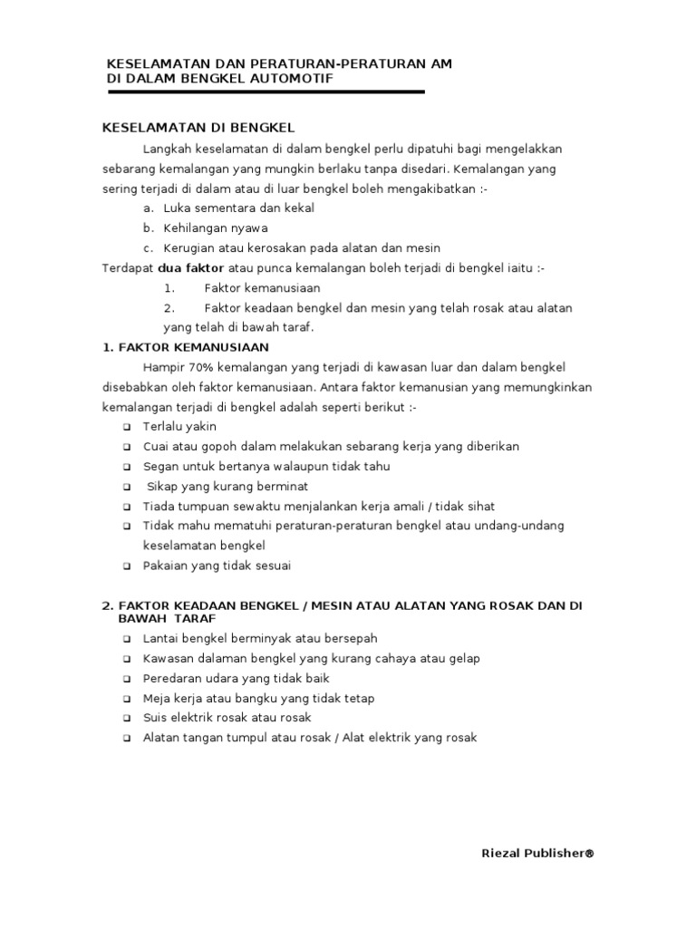 Pdf Penerapan Amalan Keselamatan Penggunaan Bengkel Dapur Dikalangan Pelajar Jurusan Hospitaliti from i1.rgstatic.net Suchen und vergleichen sie lan penge online. Ia ditawarkan kepada semua murid di tingkatan 1 hingga tingkatan 3. Selain itu, peraturan keselamatan di dalam bengkel juga disediakan untuk menghindarkan kemalangan selain menyemai sikap tanggungjawab dalam kalangan murid. Peraturan keselamatan di dalam bengkel terbahagi kepada tiga bahagian iaitu : Pengurusan dan keselamatan bengkel 1. Peraturan keselamatan alatan dan bahan Peraturan keselamatan di dalam bengkel terbahagi kepada tiga bahagian iaitu : Dec 10, 2014 · selain itu, peraturan keselamatan di dalam bengkel juga disediakan untuk menghindarkan kemalangan selain menyemai sikap tanggungjawab dalam kalangan murid.